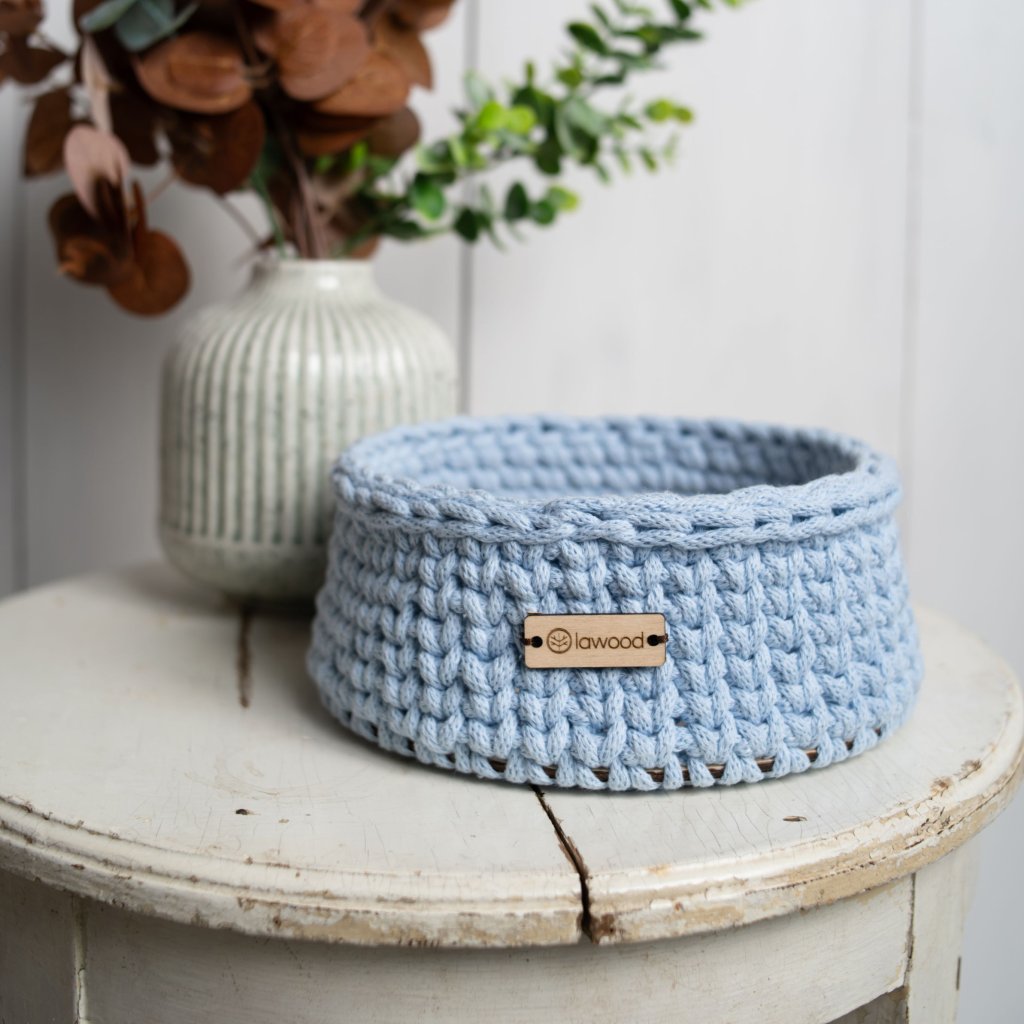 Kulatý háčkovaný košík ve světle modré barvě o rozměrech 20x20 cm rozjasní každý prostor. Ručně háčkovaný z kvalitního materiálu, který zaručuje pevnost a odolnost, je ideální na uspořádání drobností nebo jako výrazná dekorace. Tento veselý a praktický košík přináší do interiéru hřejivou atmosféru a pozitivní energii.