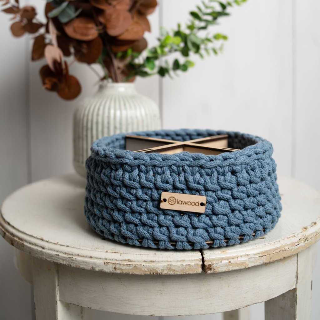 Kulatý háčkovaný organizér v nadčasové modrý barvě o rozměrech 20x20 cm je skvělým společníkem pro uspořádání vašeho domova. Jeho elegantní a moderní design v kombinaci s jemným háčkovaným vzorem dodává prostoru šarm a útulnost. Vyrobený z kvalitního materiálu, tento organizér je dostatečně pevný, aby unese vaše drobnosti, a zároveň dostatečně lehký, aby se snadno přenášel.